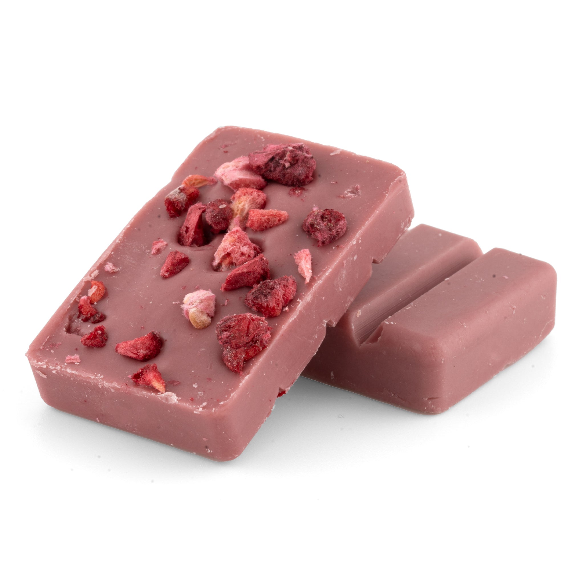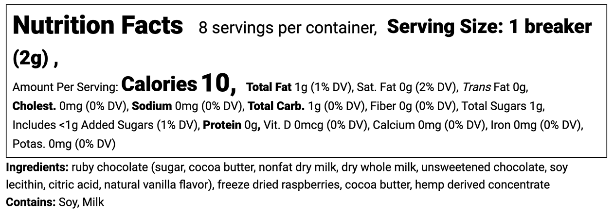Ingredients: ruby chocolate (sugar, cocoa butter, nonfat dry milk, dry whole milk, unsweetened chocolate, soy lecithin, citric acid, natural vanilla flavor), freeze dried raspberries, cocoa butter, hemp derived concentrate